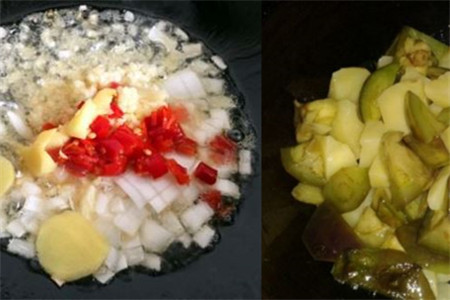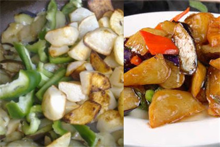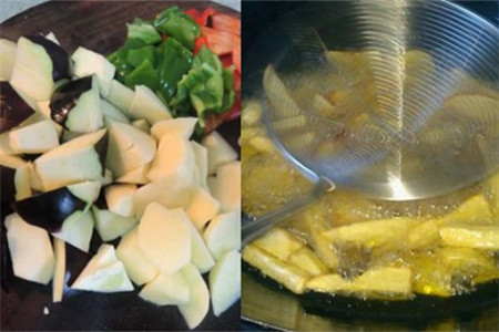 先把土豆的泥洗干净,然后把皮去掉,滚刀切。茄子不需要去皮,只需要把它切菱形,然后浸泡在水里。茄子我们一定要泡,因为茄子泡出来的水是黑的。青椒和红椒都要把籽去掉,然后洗干净,切成三角形。我们在炒锅中多放一点油,把油烧开,然后分别将土豆,茄子,青椒,红椒,放在锅里炸,炸好后,捞起来放在碗里待用。
