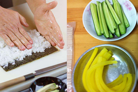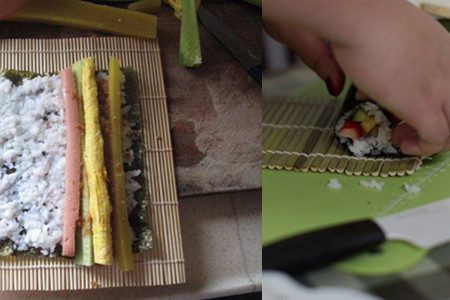 如果我们喜欢吃鸡蛋或者火腿,我们也可以准备一些这样的食材。接下来,我们需要将我们事先准备好的食材按照顺序放在米饭上面,然后我们需要将整张紫菜放在用来卷寿司的竹帘之上。之后,我们需要用竹帘轻轻地卷住寿司,然后用力的握住它,这样可以使它更加紧实,吃起来味道也会更好。