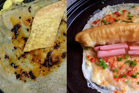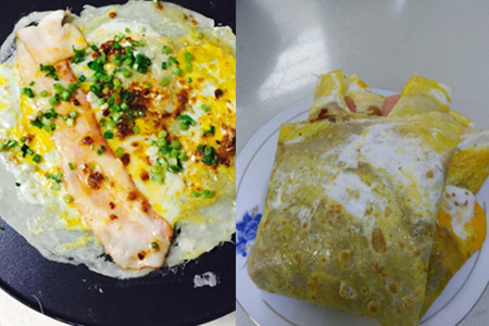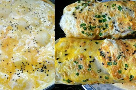 我们需要事先将准备好的各种粉搅拌在一起,然后用水兑成糊状,在平底锅里面摊成一张饼盖。然后在上面打一些鸡蛋,如果喜欢吃辣椒,也可以在上面涂一些辣酱或撒一些葱花。之后,我们可以在上面放一些油条或者是香肠。