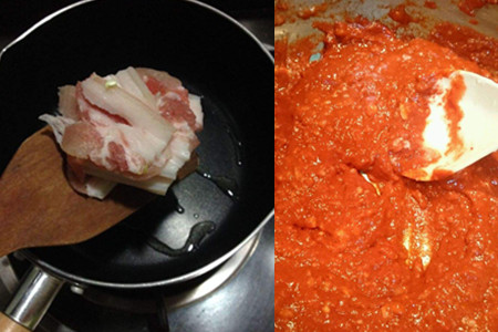 之后,我们还需要准备一块五花肉,之所以使用五花肉是因为它的味道特别香。我们需要在锅里面放入一些油,然后将它放入锅中煎制一段时间,待它表面煎至金黄的时候将它盛出来。除此之外,我们还需要准备一些辣酱,因为在制作汤的时候辣白菜的辣味有可能不够,如果我们可以使用一些制作辣白菜食用的辣酱,那么会使汤的味道更浓。