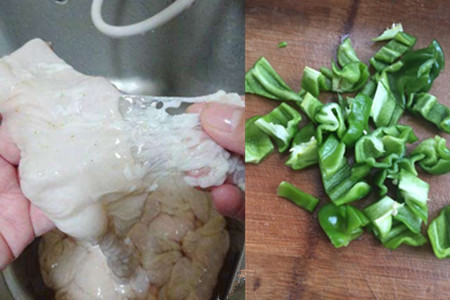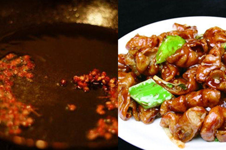 6、将适量的食油倒入炒锅之中,油温烧热开始出现密集的气泡后。把洗净的花椒和生姜片下入油锅之中,当花椒和生姜的香味开始挥发出来后。紧接着把大肠放入炒锅中,用锅铲进行均匀地翻炒。这时候再撒上些食盐,淋上些许的酱油、料酒进行上色,翻炒片刻便可盛盘备用。