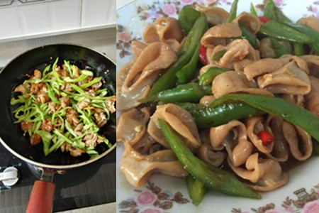 7、再往炒锅中倒入些许的食油,油温烧热到七八成时。把辣椒下入油锅之中,翻炒出香味后。把蒜苗下入炒锅中,撒上些食盐煸炒。蒜苗开始变色后,把之前炒好的大肠放入锅中。在出锅之前,撒上些鸡精便可关火食用了。