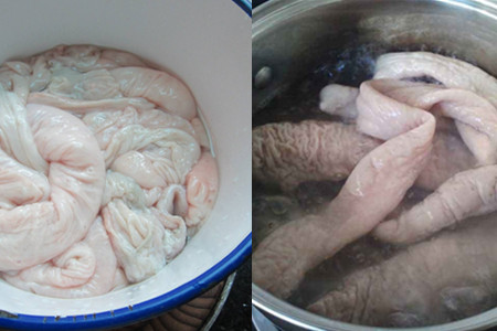 2、先将从超级市场买回的新鲜的猪大肠先用淘米的水浸泡片刻,再从任意一段的肠口把大肠翻面。把里面的油脂和杂质撕掉,这样的肥肠吃起来会更清爽。大肠撕掉油脂后,用温水冲洗一遍。再往里加入些许的白醋进行反复地揉搓,紧接着放在水龙头的流水下冲洗一遍。再在大肠上撒上些许的食盐,用手进行反复的搓洗。食盐不仅可以起到杀菌的作用,还能通过摩擦大肠的表皮去除上面的油脂。