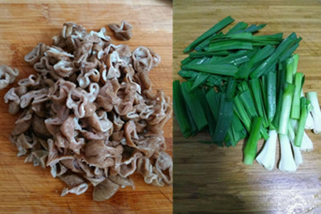 1、准备的食材有猪大肠、蒜苗、辣椒、生姜。