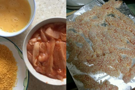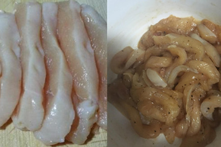 鸡柳应该算是比较受欢迎的,但是吃鸡柳尽量不要在外面买,因为商家用来炸食物的油可能用了好久都没有更换。自己做不仅成本比较低,主要是吃起来放心。我们主要的食材就是鸡胸肉,洗干净之后用刀背敲几次,肉质比较鲜嫩,然后切成长条状放在一个大碗里。倒入适量的精盐、胡椒粉、蚝油腌制十分钟,鸡肉还是比较容易入味的,腌制时间不用太久。