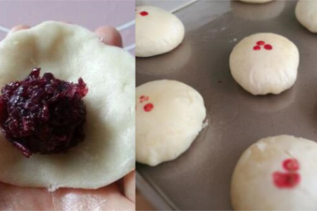 然后我们将做好的面团都盖上一层塑料膜,发酵半个小时。半个小时之后,我们将面团擀成圆圆的薄片,加入之前我们做好的玫瑰馅,将它包好,再将包好的面团稍微压扁。注意在每个面团中放入的玫瑰馅,不宜放入的过多,避免面团包不住玫瑰馅。将所有的面团按照以上的方法做好之后,我们将它们放入烤盘之中,再放进烤箱烤制。