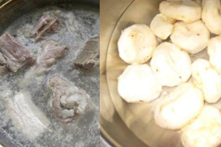 4、将适当量的清水注入煮锅之中,水滚开冒泡后。把猪骨全部下入煮锅之中,焯煮几分钟即可捞出。这样做出来的汤既不会有很多油,也可以去除掉猪骨的腥味和污血,炖出来的汤会更加鲜美。