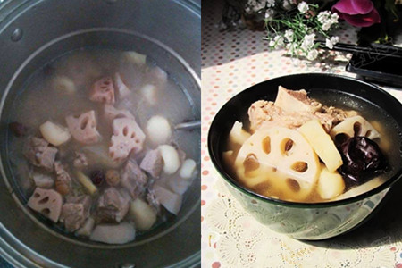 6、将适量的清水注入炖锅之中,再往锅中依次加入些许的葱姜、大枣、猪骨,淋上些料酒。大火煮至汤汁滚开后,紧接着把准备好的莲藕和荸荠一起下入锅中。盖上盖子,中火继续炖煮四十分钟。