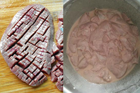 2、先将买回的新鲜的猪腰横着对半切开,把它平铺在菜板之上。用刀剔除干净上面的腰臊,一定要剔除干净,这样才不会有腥味。再把猪腰放在流水下,冲洗干净上面的杂质。用刀在猪腰上划十字,再切成小块。