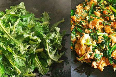 继续在油锅里面倒入一些食用油,等到油烧热了以后,就将之前洗干净的刺儿菜倒入进去翻炒,由于这种蔬菜很嫩,所以不需要翻炒太长的时间,大约3分钟左右就可以将鸡蛋放在里面一起翻炒了。