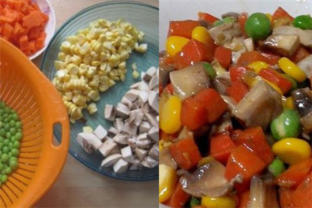 豌豆蘑菇小炒听起来挺难做的,其实做法十分简单。我们先把豌豆,胡萝卜,蘑菇,玉米,鸡精,油,盐,淀粉准备好。食材准备好后,将它们全部洗干净,胡萝卜,蘑菇全部切成丁。豌豆我们先在开水中焯一下水,尽量把它烫熟。在锅里放入适量的油然后把胡萝卜,玉米,蘑菇,豌豆全部倒进锅中一起炒,放一点盐和鸡精,翻炒均匀后就可以了。