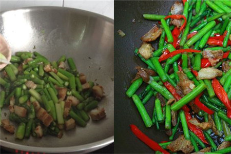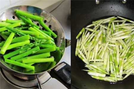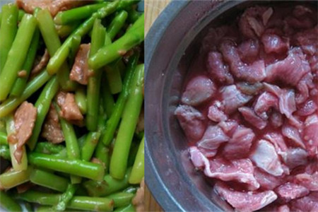 做芦笋炒肉还有一样重要的食材,那就是芦笋。我们需要先把芦笋的表面的老皮去掉,然后洗干净,再切成片。我们在热锅中多放一点油,然后把腌制好的猪肉倒进锅中快速翻炒。等肉炒至6分熟时,就可以把芦笋倒进锅中,然后翻炒均匀,再添加适量的清水盖上锅盖慢慢煮。等汤汁煮干后,加一点鸡精,就可以了,芦笋炒肉算得上是我们饭桌上的必备美食。