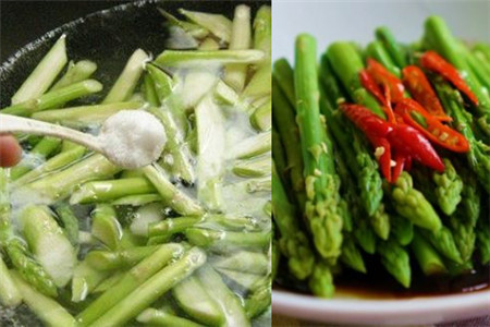 我们还可以做白灼芦笋,先需要把芦笋放在开水中煮上一会儿,然后再捞起来,芦笋一定要煮熟。我们把煮熟的芦笋摆放在盘子里,然后再准备料汁儿。在锅里放一点油,生抽,清水,糖,等它们熔化后,就淋在芦笋上,白灼芦笋就做好了。芦笋有提高免疫力,清热解毒,利尿,降脂减肥的作用。
