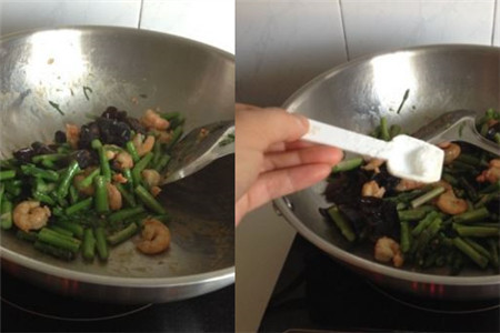 做芦笋虾仁,我们再另准备一口炒锅,先把炒锅预热,然后倒入适量的油,这时候可以开大火。待油烧热后,就可以把虾仁倒进炒锅中快速的翻炒,然后再把蒜末也倒入虾仁中,翻炒均匀。等虾仁炒变色后,就可以把芦笋也倒进炒锅中,用大火快速的翻炒。等芦笋虾仁炒熟后,就可以放一点调味盐,然后再翻炒均匀,就可以关火,全部盛在盘子里。