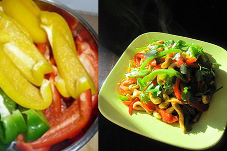 炒锅里面继续倒入食用油,将彩椒和腰果放进去翻炒,紧接着就是加入之前炒好的鸡肉块一起翻炒。只需要翻炒5分钟就好了。