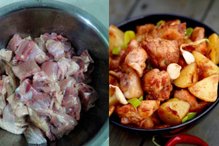 这是一道非常简单的家常菜,味道咸香可口特别适合下饭。首先把买来的鸡剁成块状,把土豆去皮洗净切块备用。锅烧热后不需要倒油,直接把鸡肉倒入锅中干炒,等水沥干后倒入姜丝继续炒,接着就可以倒入腐乳炒,等鸡肉变成金黄色就可以加入土豆块。转大火持续翻炒,加入盐和酱油调味,接着倒入半碗水盖上锅盖焖,等汁水收干就完成了。