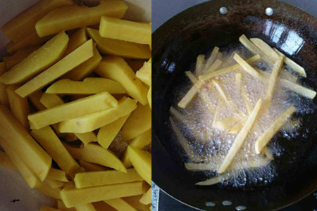 我们需要将事先洗好的薯条控干水分,然后放入油锅中将它炸一遍。在炸的时候我们需要注意,要等到油锅七八分热的时候再将薯条放入油锅中,这个时候效果是比较好的。待它外表慢慢变黄之后,我们可以用漏勺将它捞出来。