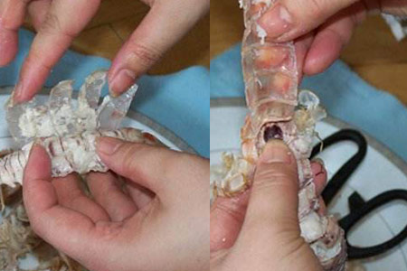 2、也有一些朋友喜欢先用剪刀将虾头、虾尾等部分都剪掉,然后剪掉虾壳的一侧,这样再将背部的虾壳往旁边一剥,里面的肉就会直接露出来。