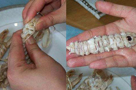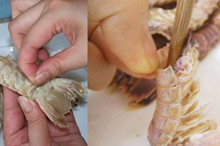 3、朋友们可以先将皮皮虾的腿拧断,然后将尾部轻轻一折,这样尾部的壳就被剥掉了。然后朋友们就可以将筷子从尾部贴在皮皮虾的背部插到前头,这样背部的硬壳很容易就被拨开,里面的虾肉会保持的比较完整。