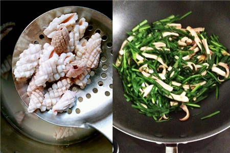 为了让鱿鱼的口感可以更加的滑嫩一些,在制作韭菜炒鱿鱼之前,我们先用清水将鱿鱼煮一下,这样可以让鱿鱼更容易炒熟。然后将食用油往锅内倒,倒入的分量要尽可能的比日常炒菜的分量多一些,将鱿鱼丢入油锅中翻炒。翻炒的时间要尽可能的短一些,这样才可以让鱿鱼的滑嫩口感保持住,然后将鱿鱼从油锅中捞出,先盛在盘子里面待用。