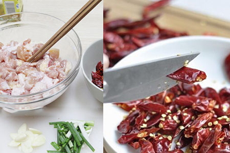 1、制作辣子鸡一般要用鸡腿肉,将骨头剔除,并将肉切成三厘米左右的小块并放入到容器之中,并用料酒、盐、水淀粉拌匀。然后准备好适量的花椒、姜片、蒜、葱以及辣椒。为了让口感更为地道,朋友们要用剪刀将辣椒剪成小段,而且其中的辣椒籽也不要扔掉。