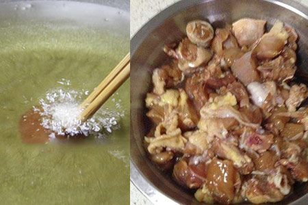 2、在锅中倒入食用油并烧至六成热。将筷子放入热油之中,表面上有一些小气泡,这时候就可以将鸡块放入热油之中。当鸡块炸至金黄色之后,就需要及时地盛出。制作的过程中,不能用太高的温度,不然的话鸡块炸出来颜色会发焦。等几分钟之后,再将鸡块倒入热油之中再炸一次,这样吃起来才会更鲜美。