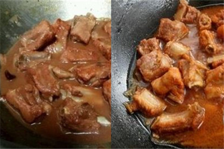 等排骨的两面都煎成黄色后,就可以盛在碗里了。我们可以利用炒锅中剩下的油,把生姜,葱,蒜炒香。我们再把腐乳汁,料酒,生抽,冰糖加在锅里,翻炒均匀。我们还需要加一点水在锅里,然后用大火烧开,再转为小火。我们只需要收汁就可以了,汁收干后,就可以盛在盘子里了。