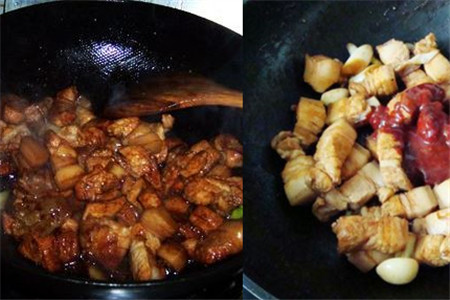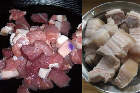 我们需要在锅里烧一点开水,等水沸腾后,就可以把五花肉倒在锅里焯一下水。我们需要把水面上的白沫用勺子舀掉,然后把五花肉捞起来沥干。我们还要另起锅,等锅烧热后,就倒入适量的植物油,然后再放一点冰糖在锅里,用大火把它炒化。等糖化了以后,就可以把五花肉倒在锅里,然后需要快速的翻炒。炒的时候,我们可以开大火,炒出来的肉会好吃些。