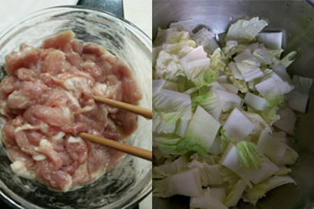 因为我们在做这道菜的时候也可以在里面加入一些青菜,这样不仅可以解腻,而且也可以使它吃起来更加有营养。之后,我们需要将事先准备好的白菜和肉片在热水中焯一遍。