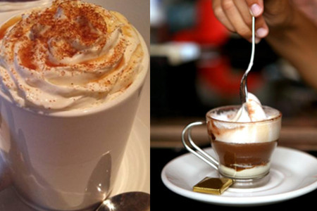 然后我们可以在咖啡上加上打发好的奶泡,如果希望奶泡更加细腻,可以用奶油代替。在奶油(奶泡)的上方浇上焦糖。可以遵守“七上八下兜两圈”的方法来浇焦糖,能够让你每一口都能够品尝到焦糖(蜂蜜)的甜味。