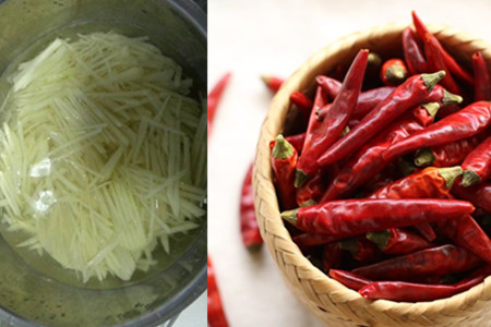 大家都知道,土豆之中淀粉的含量是十分丰富的,也是因此,炒土豆的时候总是会容易粘锅。这样一来,不仅菜糊了,味道也会不好吃。所以,把土豆切成细细的丝条之后,可以把它放在清水里面浸泡一下。这样一来,淀粉就被稀释了,一会炒起来的时候就清爽了许多。而且,这样还有一个好处,就是土豆会变得脆不少。可以一边切丝一边往水里放。