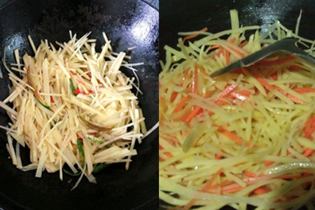 在锅中放上适量的油,等油热了冒烟的时候,就可以放下准备好的调味品了,首先是花椒,把其中的滋味激发出来,爆炒一下。然后,放入尖辣椒、葱沫、姜沫等,让味道更加充分地激发出来。等味道充分出来的时候,这段时间一般很短,这时候,就可以放入我们的主食——土豆丝了。现在是煸炒的阶段,要开大火,这样才会脆许多。