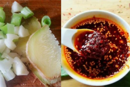 然后我们就可以调制烤猪脑花的酱料了,首先我们准备一个干净的小碗,在碗中加入适量的豆瓣酱、生姜末、葱段、生抽、蒜末等调味料,喜欢吃辣的朋友们,还可以加入适量的辣椒段,将锅中的所有调料搅拌均匀。然后我们在锅中倒入适量的油,在锅中放入一些花椒和干辣椒,将它们爆香之后,淋在酱料上。