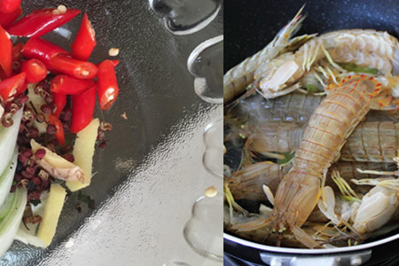 取出炒锅,倒入多一些的食用油,加热至五层左右,把葱姜蒜倒进去翻炒,然后加一些辣椒、香叶和花椒等调料,炒出香味之后把沥干水分的皮皮虾放进去。可能有些人会感觉虾子的腥味难以接受,我们可以倒一些黄酒或者是料酒,这样就不会腥了。