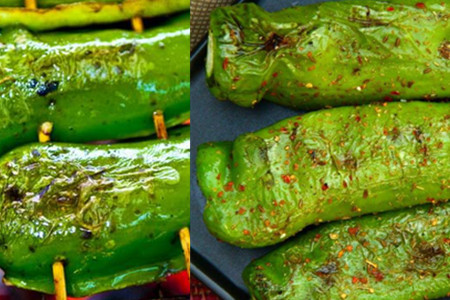 因为炭火温度比较高,所以我们需要在辣椒外层涂一层油,放在支架上烤,辣椒皮很快就会变黑,所以需要不停的转动,等到外皮起褶皱,里面的肉馅也熟了就可以吃了。烤软的辣椒,辣度也会降低很多。