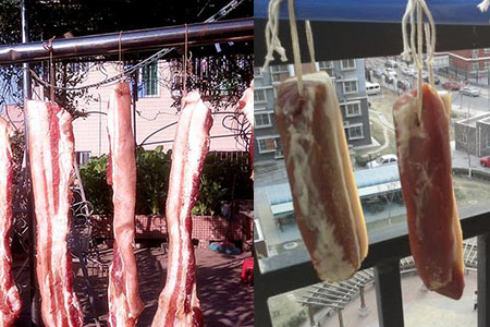 4、将熏好的腊肉放在通风阴凉的地方,并在下方铺一张报纸,以免滴下来的油水弄脏地面。一般一个月左右,肉质就会变得干燥,这就表明腊肉已经做好了。