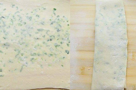 面团包好之后,将封口处向下,盖上保鲜膜再醒15分钟。醒好之后,再干净的案板上撒些干面粉,将面团放在案板上擀成长方形,将两端往中间折起来,再对折一次。将面皮旋转90度,再擀成薄片,再重复折叠一次。