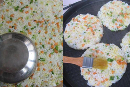 揭开米饭上的保鲜膜,准备一个小碗,将碗沿放在水中蘸湿,再放在米饭上,轻轻地压出圆形的米饼。电饼铛预热,倒入适量食用油,油热之后,将压出的米饼放入,慢慢煎制。待米饼底层煎至定型后,在米饼上层刷上少量油,翻面,双面煎至金黄就可以出锅了。