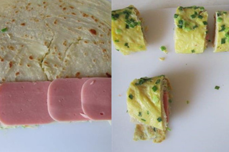 待鸡蛋饼即将完全定型后,将薄面饼放在其上。鸡蛋饼煎熟之后,取出,将鸡蛋饼朝下置于面板上,码上切片的午餐肉,卷起来切成长度适合的段状即可享用。