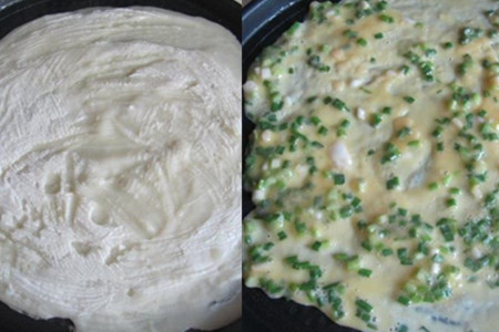 加热电饼铛,在上面均匀地刷上少许油,再把面糊倒入,将面糊摊平摊薄成饼状。薄饼烙熟自后,取出放在案板上晾凉。接着将鸡蛋液倒入,摊平摊薄成饼状。