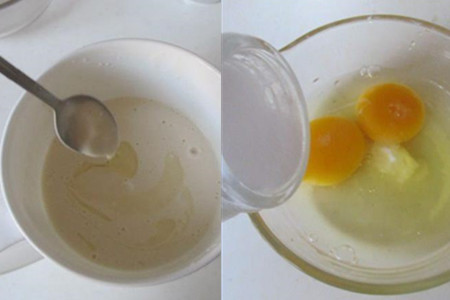 将面粉、全麦粉和少许食盐混合均匀,再加几滴食用油,搅匀。鸡蛋去壳,装入碗中,调入适量盐,搅匀,再放入葱末,搅匀。