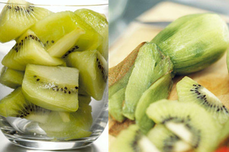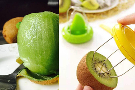 另外,我们也可以将猕猴桃的两端切掉,然后用一个勺子将它挖出来,这样可以快速去皮,而且不会将汁液溅到自己的手上,所以它是一种非常方便的做法。除此之外,市面上还有一种卖切猕猴桃的工具,我们可以用这种工具来切猕猴桃。当我们将它切割好之后,只需要轻轻一挤猕猴桃,果肉并可以自动脱落了。