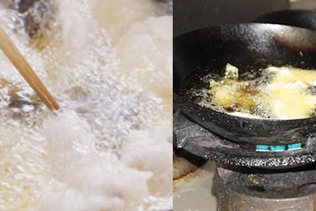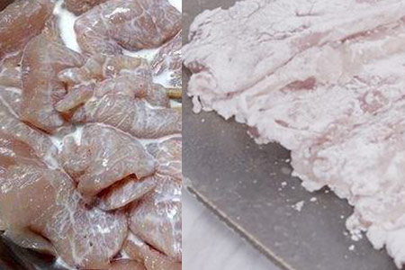 2、然后将土豆淀粉倒入碗中,并倒入一些清水浸泡半小时以上。朋友们将碗中的清水倒掉,然后将下面的淀粉抓住混合到里脊肉之中。之后将肉片一片片地下到油锅之中,然后将其炸至金黄色。为了让肉的味道更鲜美,朋友们还需要再复炸一次。