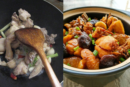 6、这时候把鸡肉块倒入炒锅中,鸡肉翻炒出水后。往里加入些许的老抽、白糖、料酒进行调味,紧接着把泡发好的香菇、土豆块加入其中。再将适当量的清水倒入锅中,水的量要没过食材。大火炖煮十五分钟左右,汤汁变得浓稠后,加入些生抽、食盐、鸡精进行调味,翻炒均匀便可出锅食用了。