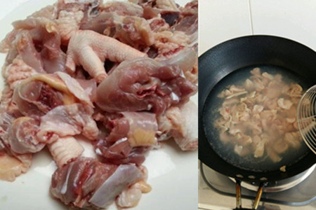 2、先将从早市买回的新鲜的已经宰杀好的鸡,放在流水下冲洗干净内外的污血。把它摆放在菜板之上,用刀斩成适当大小的块状。将适当量的冷水倒入煮锅之中,大火将锅中的水滚开后。把鸡肉全部下入沸水中,焯煮几分钟再用勺子捞出,放在水龙头下冲掉上面浮沫,摆在一旁备用。