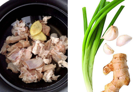 然后我们将羊肉放在锅中先过滤一遍热水,去掉羊肉的血沫。在这个期间可以先加入生姜,这对于去除膻味有很好的效果。然后我们将葱姜段等调料一同加入过滤好的羊肉汤中,慢慢的熬煮。