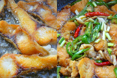 鱼块煎成双面焦黄后,将干辣椒、蒜片和姜片下锅爆香。香料爆出香味之后,调入适量生抽和老抽,加入适量白砂糖,炒匀。随后兑入适量清水,转为大火煮至汤汁沸腾。汤汁煮沸之后调入少量食盐,放入青椒段,继续煮,煮至汤汁逐渐收干,撒入葱花就可以起锅了。