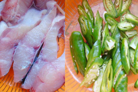 草鱼处理干净,切成小块,加入适量食盐和料酒,用手抓一抓,腌制10分钟。青椒洗净切成斜段,炒锅洗净上灶,放入适量油烧热,油烧至冒青烟后,将腌入味的鱼块下锅煎制。