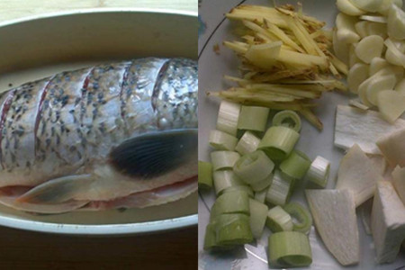 鲤鱼宰杀好,清洗干净,鱼身两面切斜刀,均匀地抹上食盐,腌制30分钟。杏鲍菇洗净切片,生姜切成细丝,葱切成小段,大蒜切成小片。