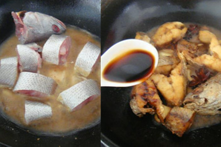 炒锅重新倒油,油热之后,将生姜片、大蒜和八角下锅爆香。锅中的香料爆香之后,将煎好的鱼块回锅,烹入适量料酒、生抽和老抽,加入一勺豆豉,兑入适量开水,转为大火煮开。待锅中的汤汁收至三分之一时,往锅里调入适量白砂糖,炒匀即可熄火,盛入碗中,撒上葱花。